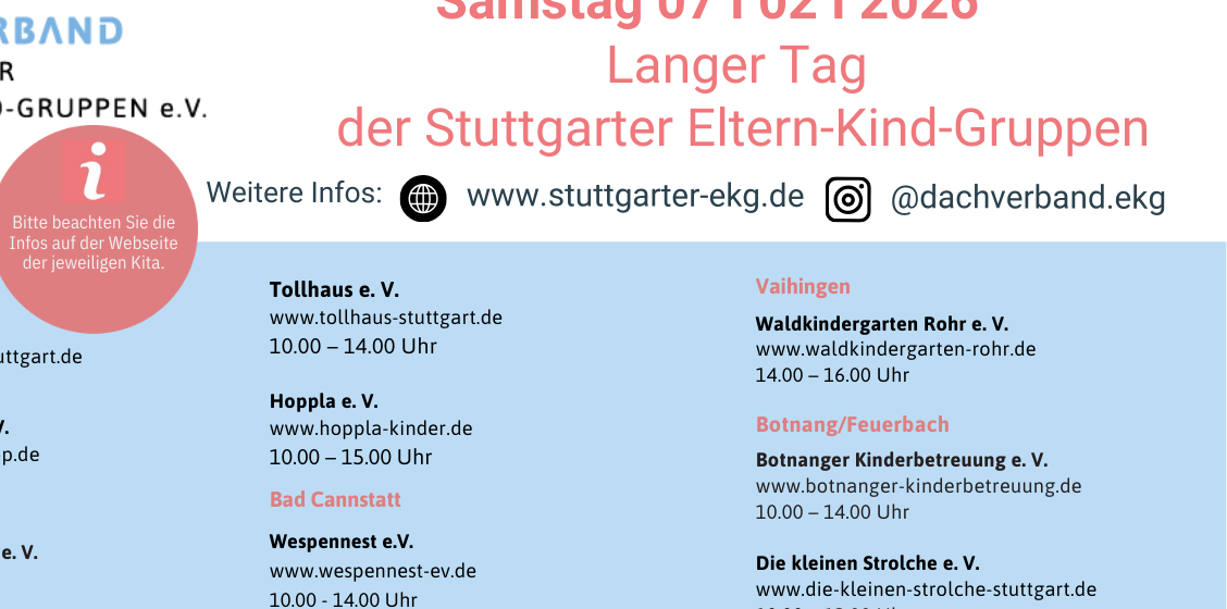 Am Samstag, den 12. November 2022, findet von 11.00-16.30 Uhr die JOBE Messe für pädagogische Fachkräfte, Eltern, Schüler*innen und Absolvent*innen erstmals wieder in Präsenz statt. Im 3.&4. Obergeschoss des Stuttgarter Rathauses könnt Ihr den Tag mit verschiedenen Akteur*innen aus dem Bereich Pädagogik und Kinderbetreuung ins Gespräch kommen und euch austauschen. Als Netzwerk, Interessenvertretung und fachliche Beratung für Träger, Fachkräfte ...